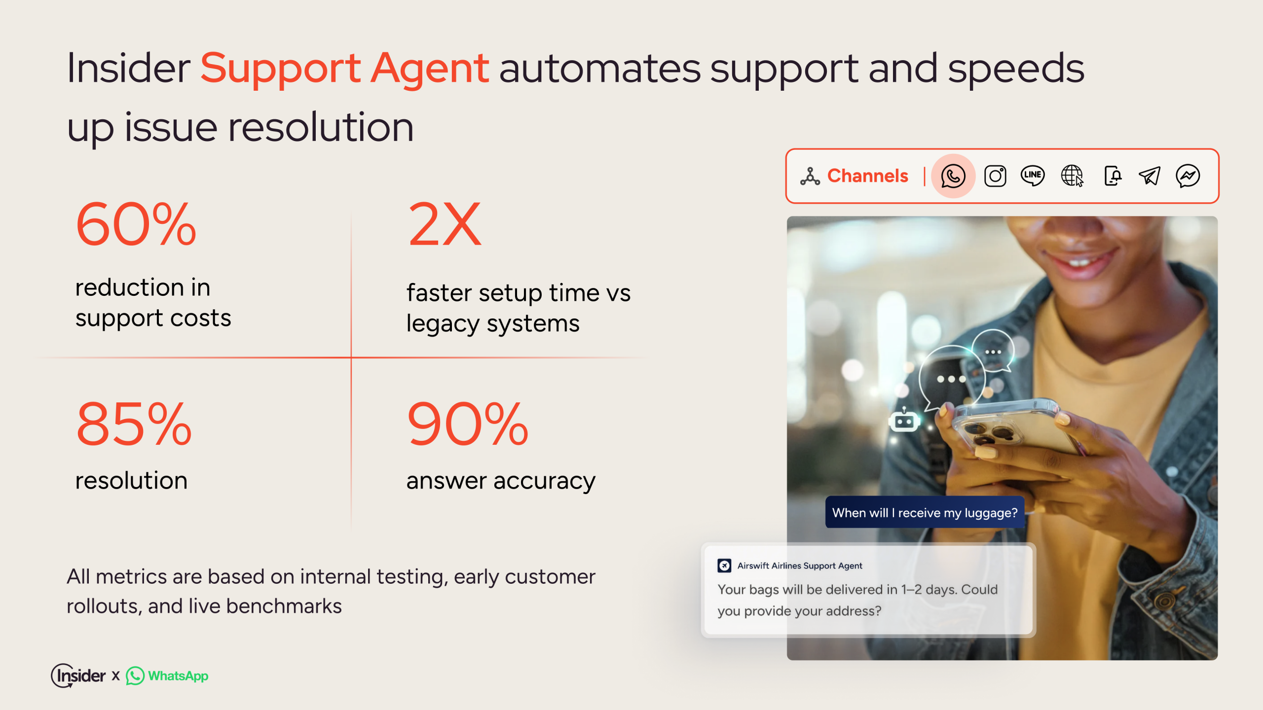 - Support Agent integrates with a brand’s existing systems (CRMs, payment gateways, order systems, etc.) and knowledge base, resulting in instantaneous and conversational support and issue resolution. It includes a personalization layer with centralized data for unique interactions and targeted communication. Early adopters report a 60% reduction in support costs, a resolution rate of 85%, and 90% answer accuracy.